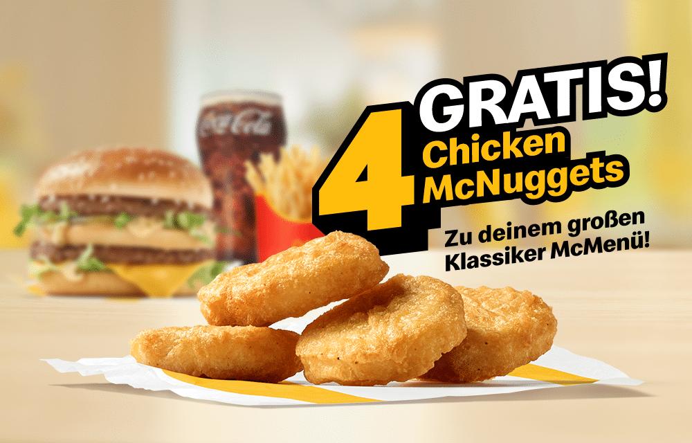 Angebot gültig von 08.04. bis 20.04.2026 in allen teilnehmenden Restaurants in Österreich, solange der Vorrat reicht. Bei Kauf eines Big Mac, McChicken, Hamburger Royal Käse, Hamburger Royal TS, Fresh Veggie Burger, 6er Chicken McNuggets, Filet-o-Fish, Grand Big Mac, Chicken Big Mac, Mac Junior und Big Mac Bacon im großen McMenü gibt es eine Portion 4er Chicken McNuggets gratis dazu. Big Mac Bacon nur in ausgewählten Restaurants erhältlich. Nicht mit anderen Rabattaktionen kombinierbar, nicht in Bargeld ablösbar und nicht über McDelivery verfügbar. Dies ist eine Aktion der McDonald’s Werbegesellschaft m.b.H., die hierfür 4er Chicken McNuggets zur Verfügung stellt. Produkt teilweise mit Schmelzkäsezubereitung, panierte Hühnerprodukte aus Hühnerfleischstücken geformt und zusammengefügt.