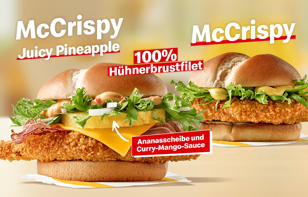 *** Unverbindliche Preisempfehlung. Der Curry Porkburger und Double Curry Porkburger, jeweils mit Schweinefleisch Patty, sind vom 03.06.2025 bis einschließlich 13.10.2025 erhältlich. Das Nice Price Menü ist erhältlich täglich ab 10:30 Uhr in allen teilnehmenden Restaurants in Österreich, solange der Vorrat reicht. Das Nice Price Menü besteht jeweils aus einem der abgebildeten Burger, mittleren Pommes und einem 0,4l Kaltgetränk (ausgenommen Bier, Red Bull, Apfelsaft und Orangensaft). Nicht mit anderen Rabattaktionen kombinierbar und nicht über Mac Delivery erhältlich.
